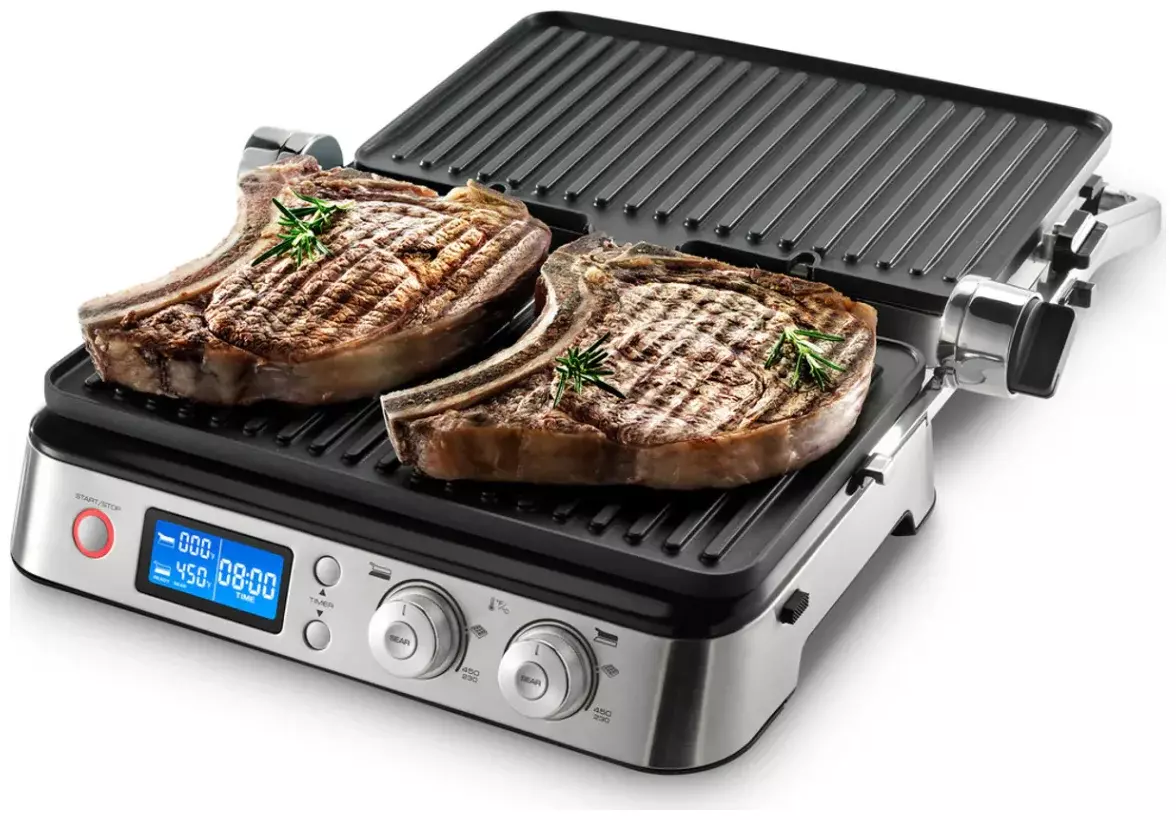 Дополнительная информация: 2 рифленые пластины и 2 плоские съемные пластины, размер рабочей поверхности 37x23 см, приложение для смартфона, таймер