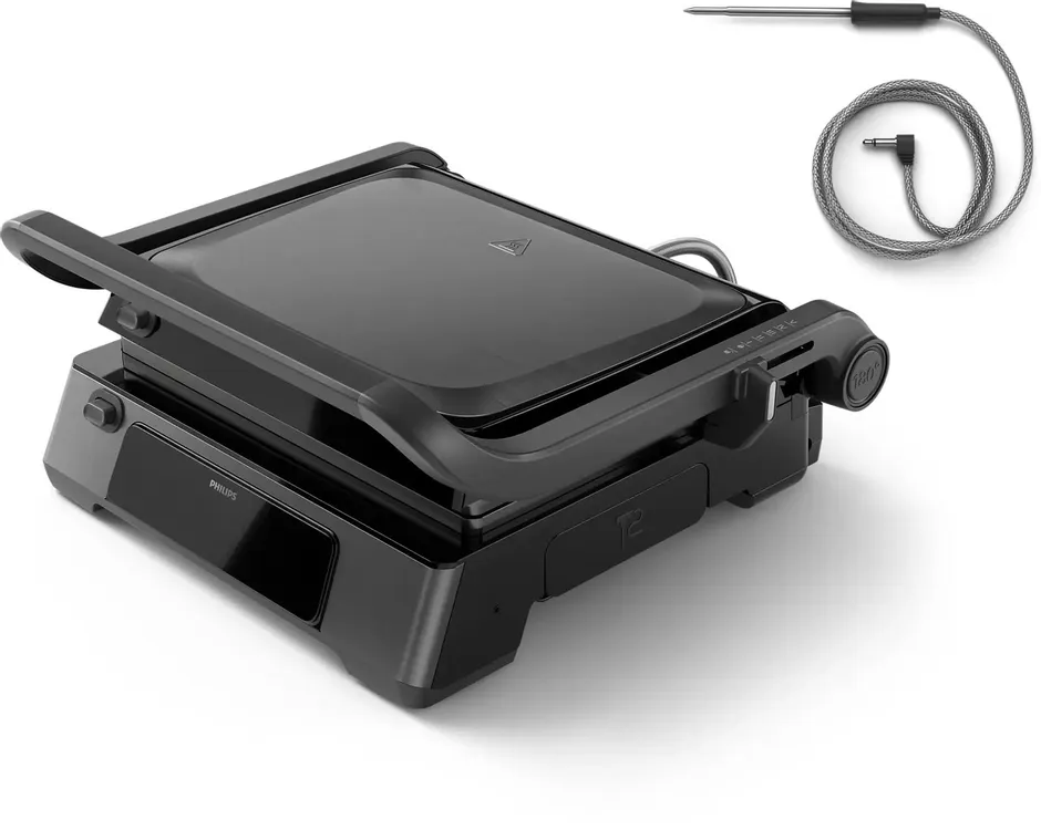 Конструкция гриля продумана до мелочей. Он имеет настольное исполнение и комбинированный корпус. Съемные пластины с антипригарным покрытием легко моются, а разборная конструкция делает уход простым. Встроенный поддон для сбора жира и внешний подключаемый кулинарный термометр, входящий в комплект, помогают готовить еще аккуратнее и контролировать степень прожарки по внутренней температуре продукта. Крышка на кронштейне надежно фиксируется в открытом положении, а нагревательный элемент типа ТЭН обеспечивает долговечную и стабильную работу.