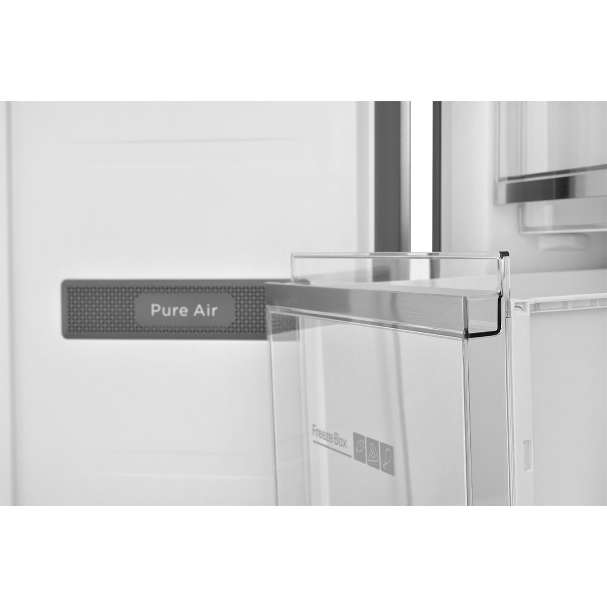Полки и ящики со стальным обрамлением, Зона свежести Smart Fresh с регулировкой температуры от -3 до 4°С, Регулятор уровня влажности Humidity Control в выдвижном ящике, Предупреждение о повышении температуры в морозильной камере, Особая конструкция и теплоотвод позволяют встроить прибор в нишу