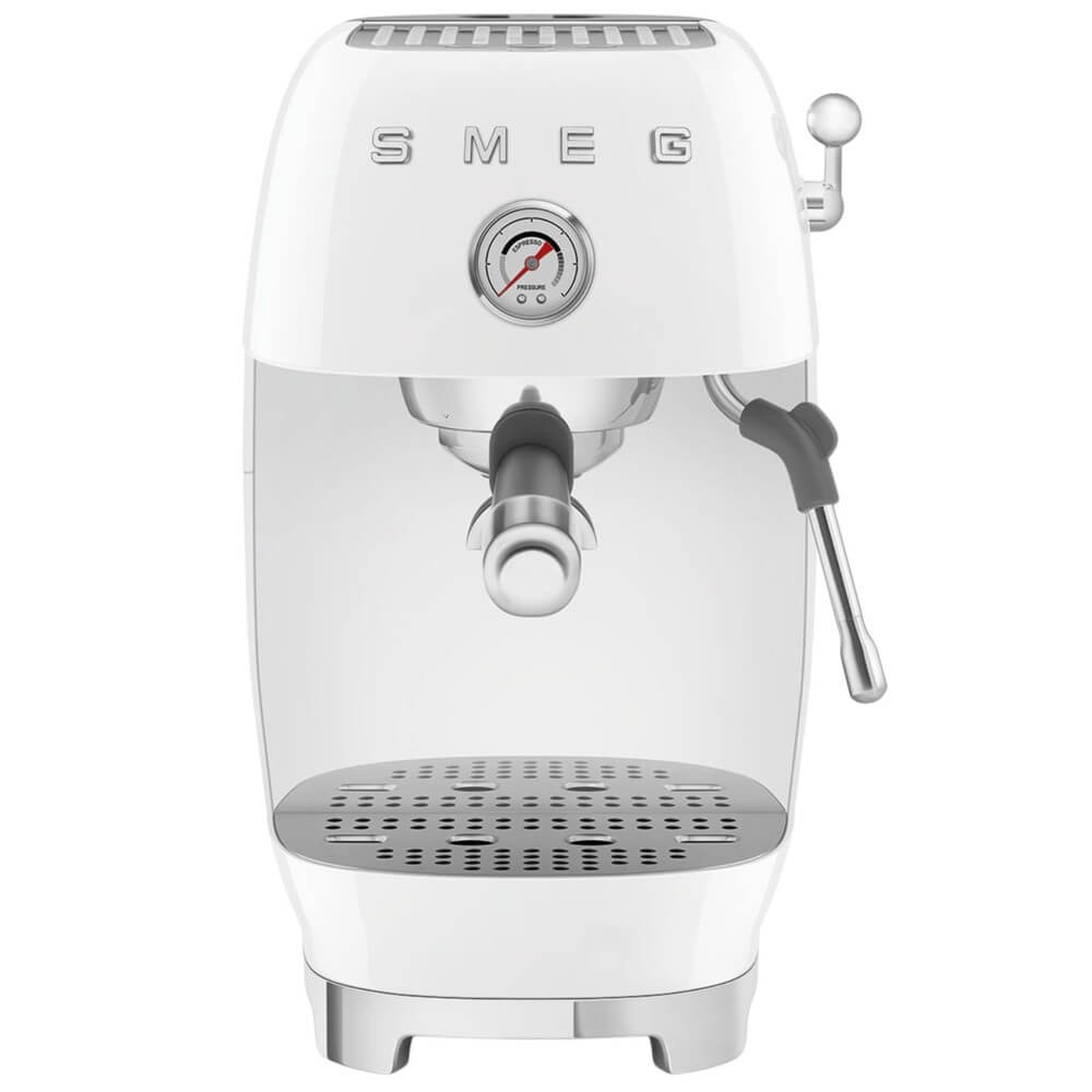 Кофемашина-эспрессо Smeg ECF03WHEU из коллекции «Стиль 50-х годов» сочетает эстетическую выверенность с продуманной инженерией. Белый лаковый корпус из алюминия в тандеме с прочными пластиковыми элементами формирует узнаваемый образ, который легко впишется в интерьер кухни и станет визуальным центром зоны приготовления напитков. Основание выполнено из пластика, что обеспечивает лёгкость и практичность при эксплуатации, а нескользящие ножки надёжно фиксируют прибор на столешнице, предотвращая смещение во время работы. Поддон для сбора капель аккуратно удерживает остатки и позволяет поддерживать чистоту без лишних усилий.