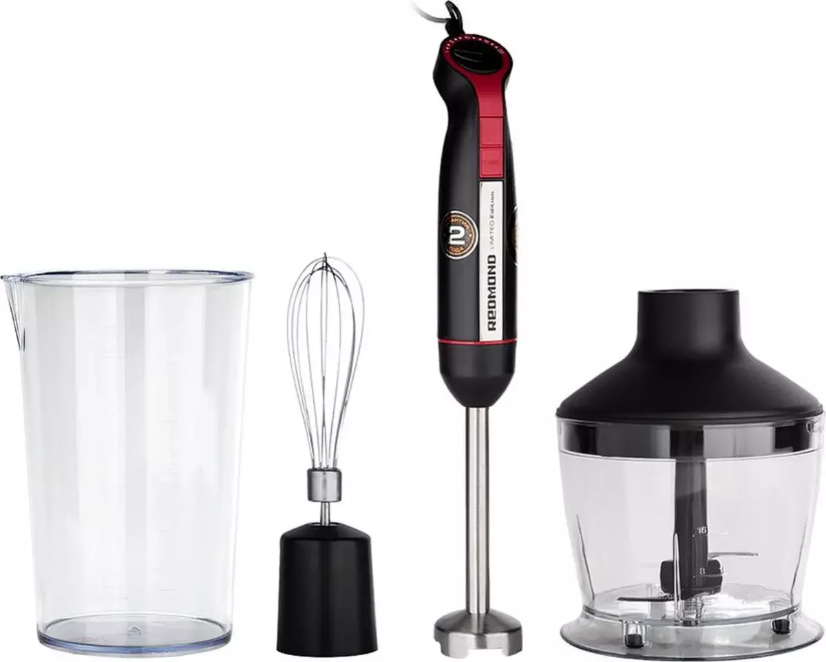 Устройство «3 в 1», совмещающее в себе функции погружного блендера, миксера и измельчителя. Скорость работы в основном режиме: 9700-12400 об/мин ± 15%. Скорость работы режиме «Турбо»: 14600 об/мин ± 15%. Объем чаши измельчителя с крышкой 500 мл. Объем стакана для смешивания 600 мл.