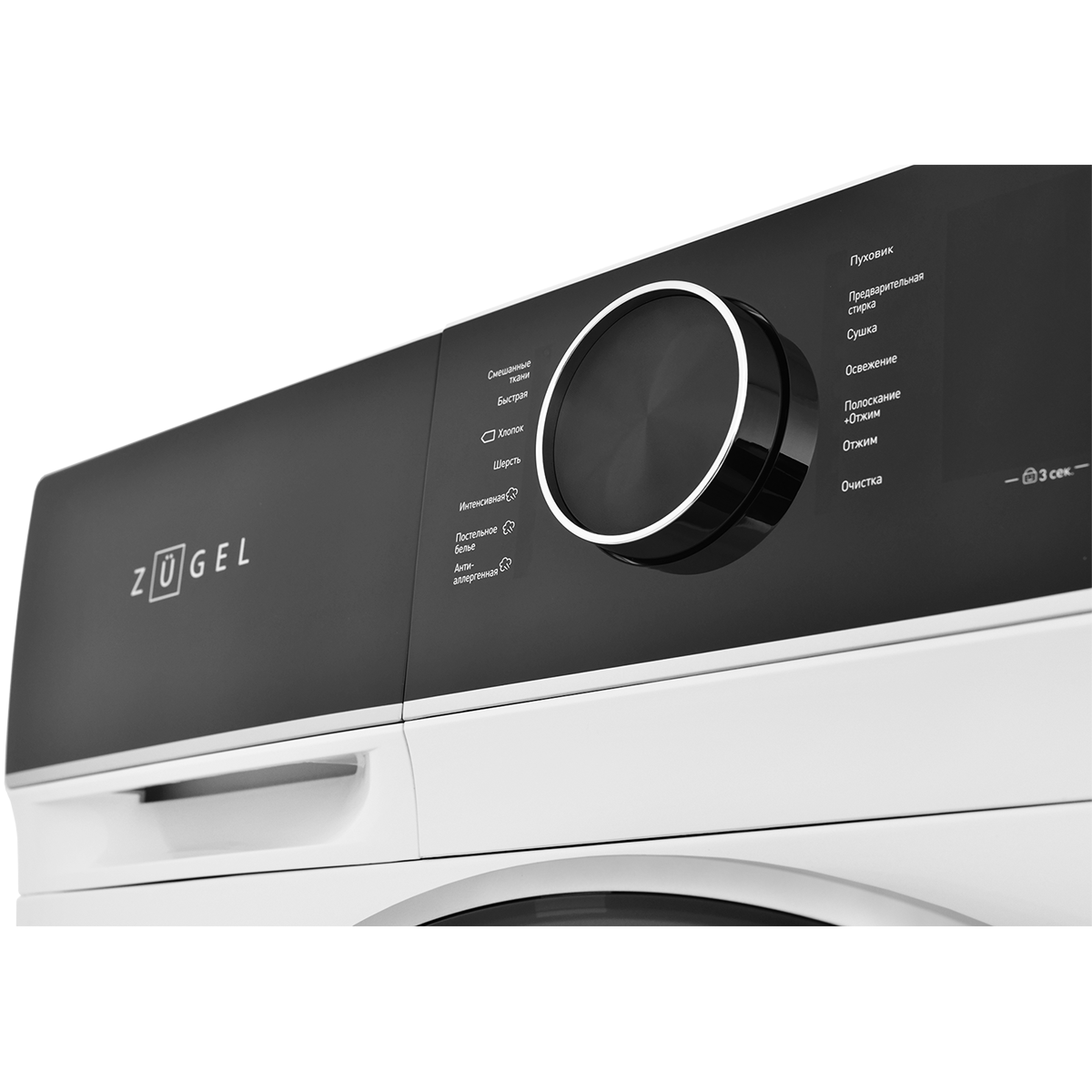 Антибактериальная защита, Автоматическая блокировка двери, защита от перелива, защита от перегрева, Автобалансировка барабана, Черная матовая панель управления, Большой премиальный люк с хромированным ободом