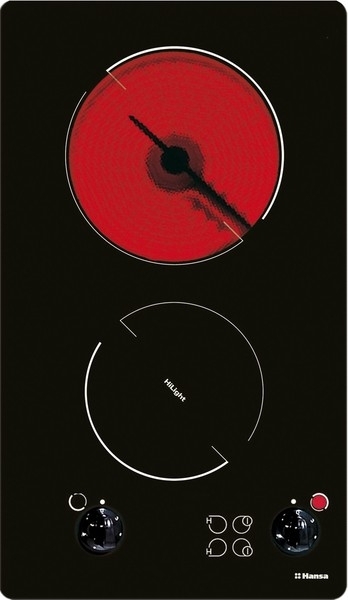 общая мощность: 3 кВт; раздельная регулировка каждой зоны нагрева; высота панели: 5 см; размеры конфорок: 14.5 и 18 см; длина шнура электропитания: 150 см