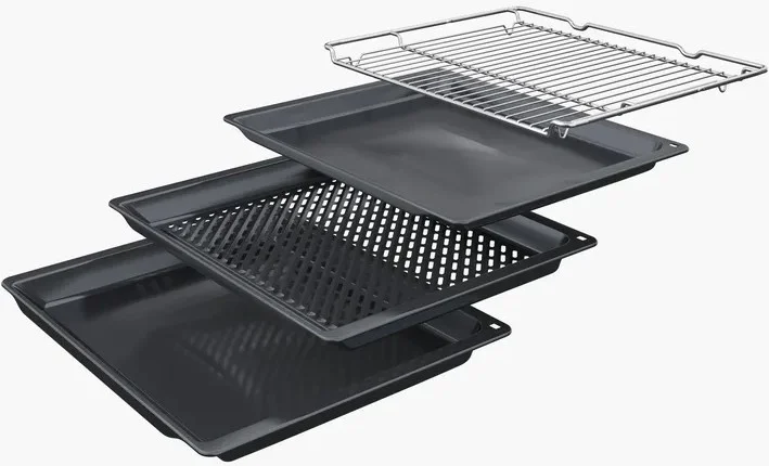 Удобство использования усилено продуманной эргономикой: откидная дверца с мягким доводчиком SoftOpen открывается плавно и без резких ударов, а телескопические направляющие на одном уровне упрощают извлечение противней и форм, повышая безопасность при работе с горячими изделиями. Наличие блокировки от детей делает эксплуатацию безопасной в семьях с малышами, а в комплекте поставки идут эмалированная решетка и универсальный противень, дополнительно предлагается специальный Air Fry противень для приготовления хрустящих закусок.